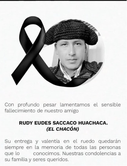 En el lejano poblado de Alaypampa, distrito de Huaccana, provincia de Chincheros, Apurímac, el joven Rudy Eudes Sacacco Huachaca, murió tras ser corneado por un toro en la fiesta tradicional de su pueblo.